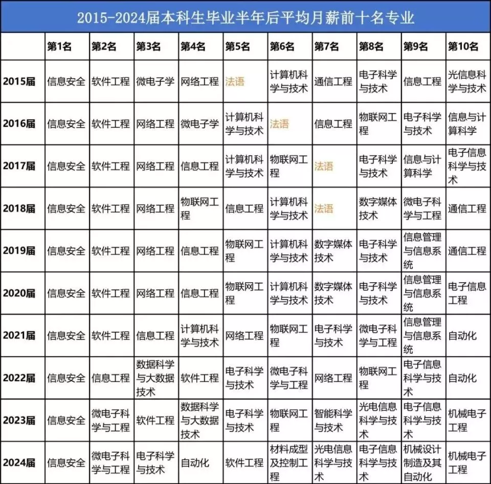 2015-2024届本科生毕业半年后平均月薪前十名专业
