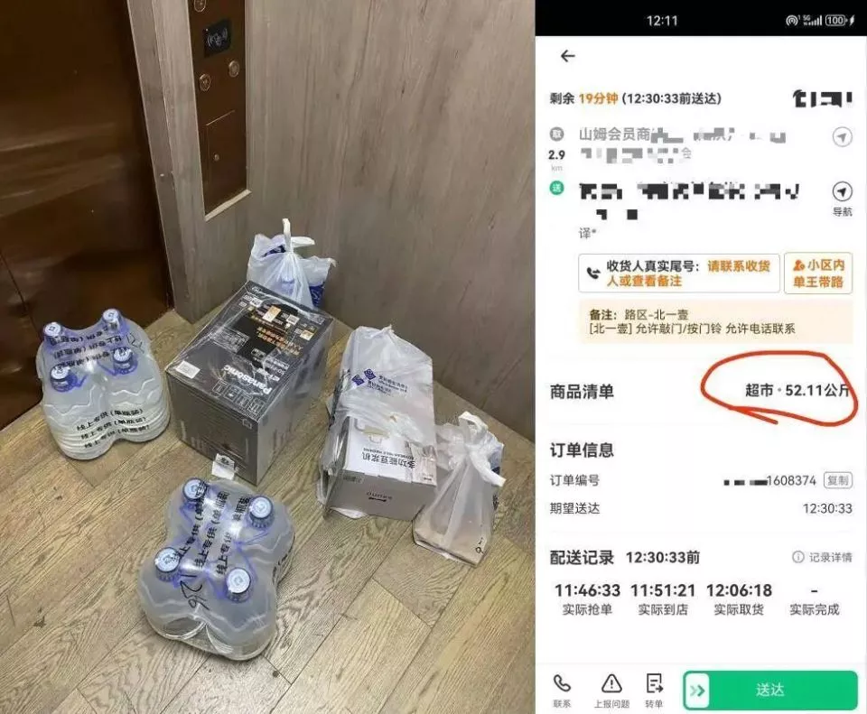 在这里,重量被重新定义。小于20公斤算轻松,超过的被配送员称为“炸弹”——山姆会员商店主打家庭囤货,瑞士卷一盒起卖,16个,重1.2公斤;三两就能炒一盘的五花肉,2公斤起卖;还有客户一单下了20箱饼干。商店多开在郊区,满99元免15公斤运费,承诺一小时内送达的极速达配送成了会员们的心头好。