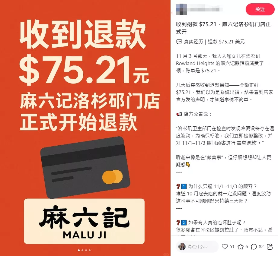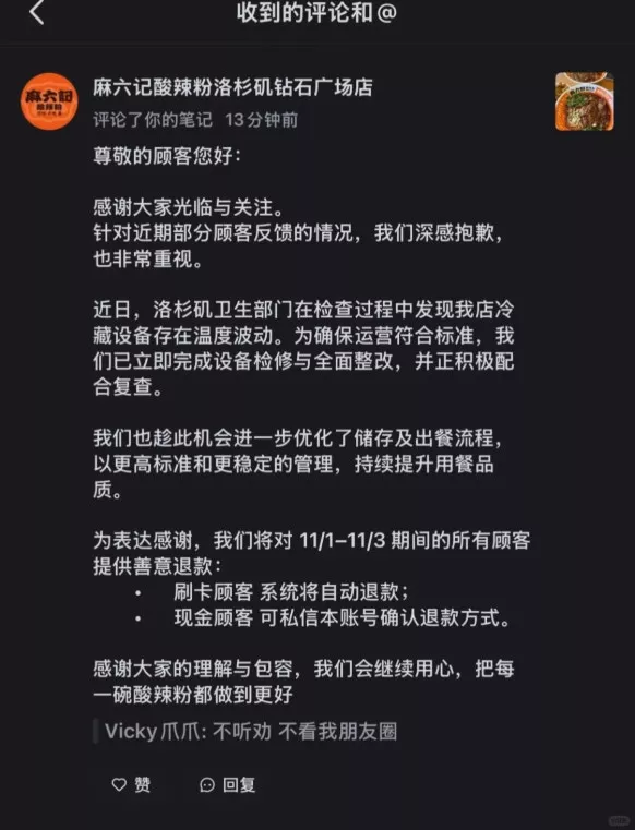 截至目前,麻六记官方还未回应事件。不过,小红书上一个名为“麻六记酸辣粉洛杉矶钻石广场店”的账号在相关投诉帖下方留言致歉,表示对近期部份顾客反馈的情况,深感抱歉,也非常重视。经洛杉矶卫生部门检查,是因店内冷藏设备存在温度波动导致,目前已完成设备检修全面整改,将对11/1-11/3期间所有顾客提供退款。