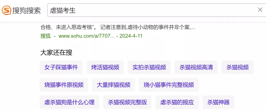 确实,这几年虐猫等虐待动物事件频发,一次次牵动我们的神经。比如,前两年曾引发广泛关注的“虐猫考生”徐某因虐待动物被南京大学拒录。而当我们搜索这类事件时,会关联发现各类“杀猫”、“虐猫”