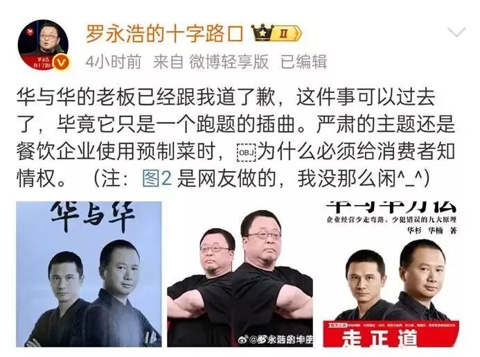 26日上午,他更是把狠话放到底:“今天下午六点前,华杉不公开道歉,未来中国市场公关行业,没人会记得华与华,只会记得‘罗与华’!”