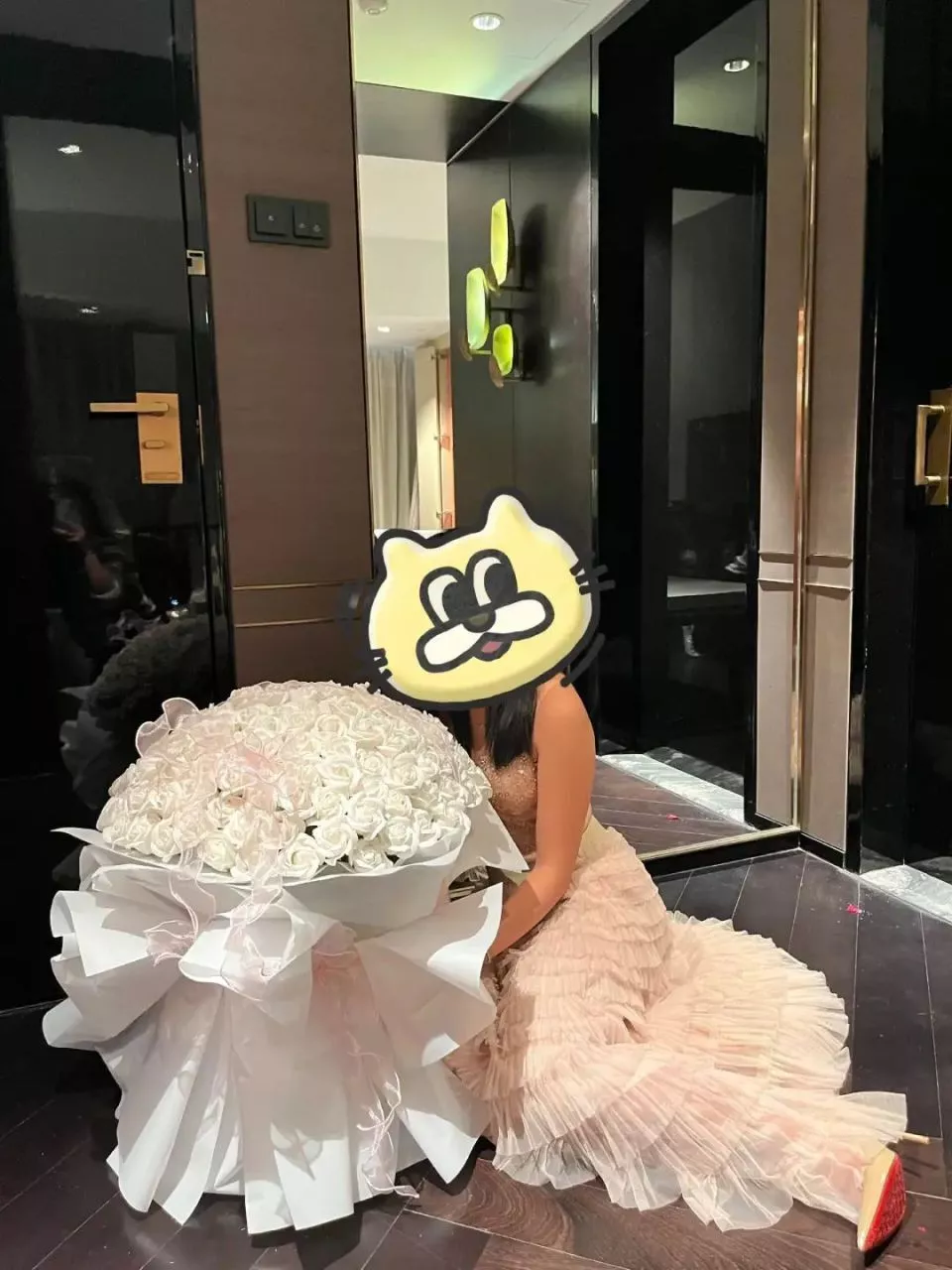 因为是生日主题,房间里摆了束巨型永生花,地上散着花瓣,摄影师还当场用打气筒又吹起了两个玫瑰金爱心气球,营造出的感觉是这儿刚结束一场盛大的party。当然,沙发上还摆着名媛不可或缺的好朋友——一只玲娜贝儿玩偶——。