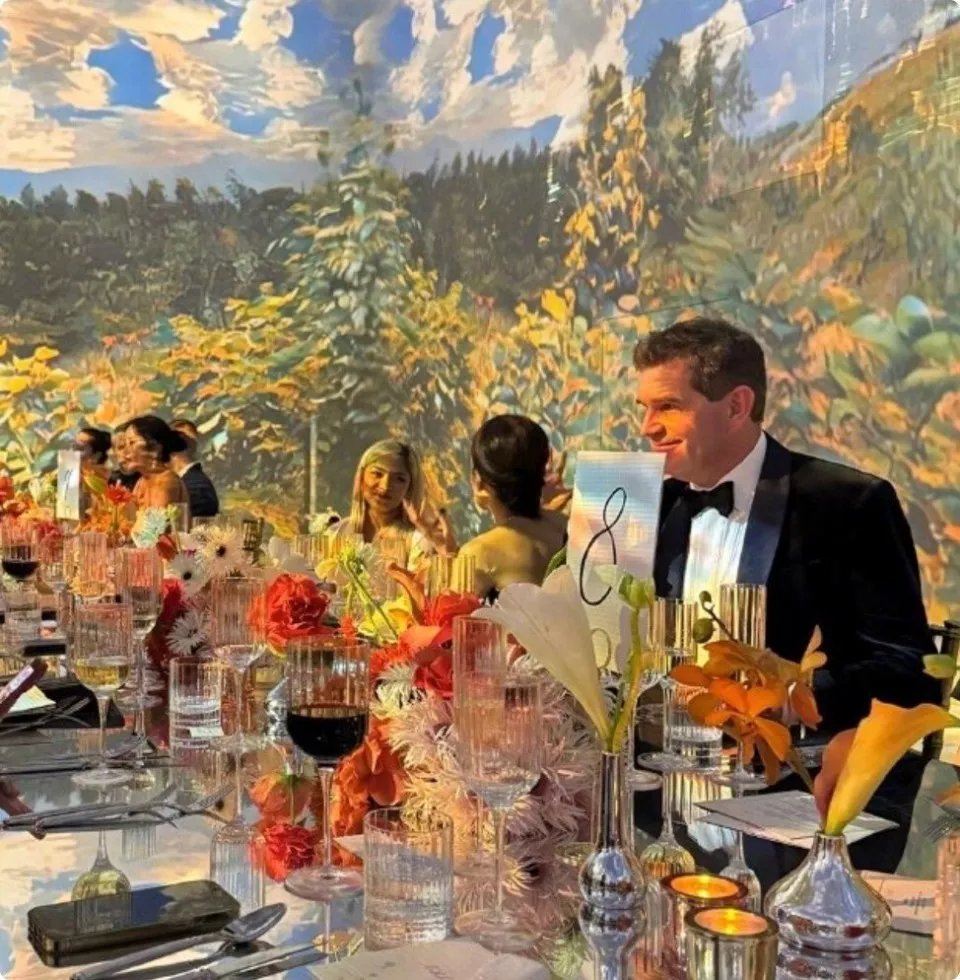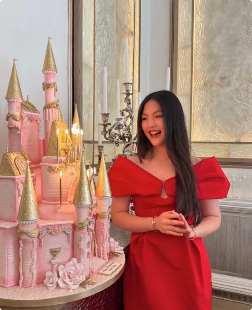 宴会厅被布置成金色的欧式城堡,鲜花、蜡烛、长桌、气球层层铺开,蛋糕放在桌子上,比她还高。