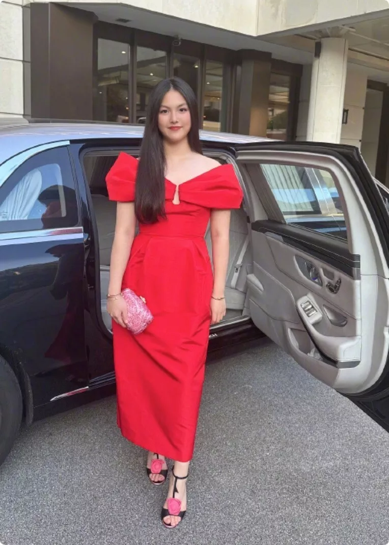 她一袭大红礼服亮相,妆发精致,举手投足都带着从容与仪式感,仿佛一位即将步入社交圈的“小名媛”。
