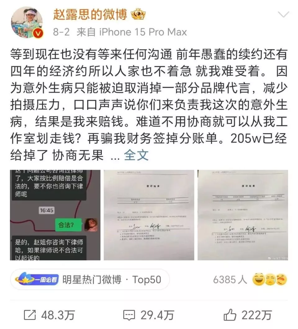 赵露思在微博发布合同纠纷相关内容