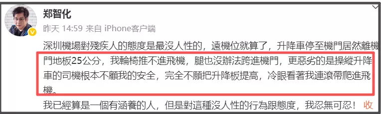 事件缘由很简单,郑智化登机遭遇升降板搭不上难题,无法乘坐轮椅登机,郑智化形容是“冷眼看着我连滚带爬进飞机”,状况惨烈,于是大众把矛头对准了深圳机场及工作人员。