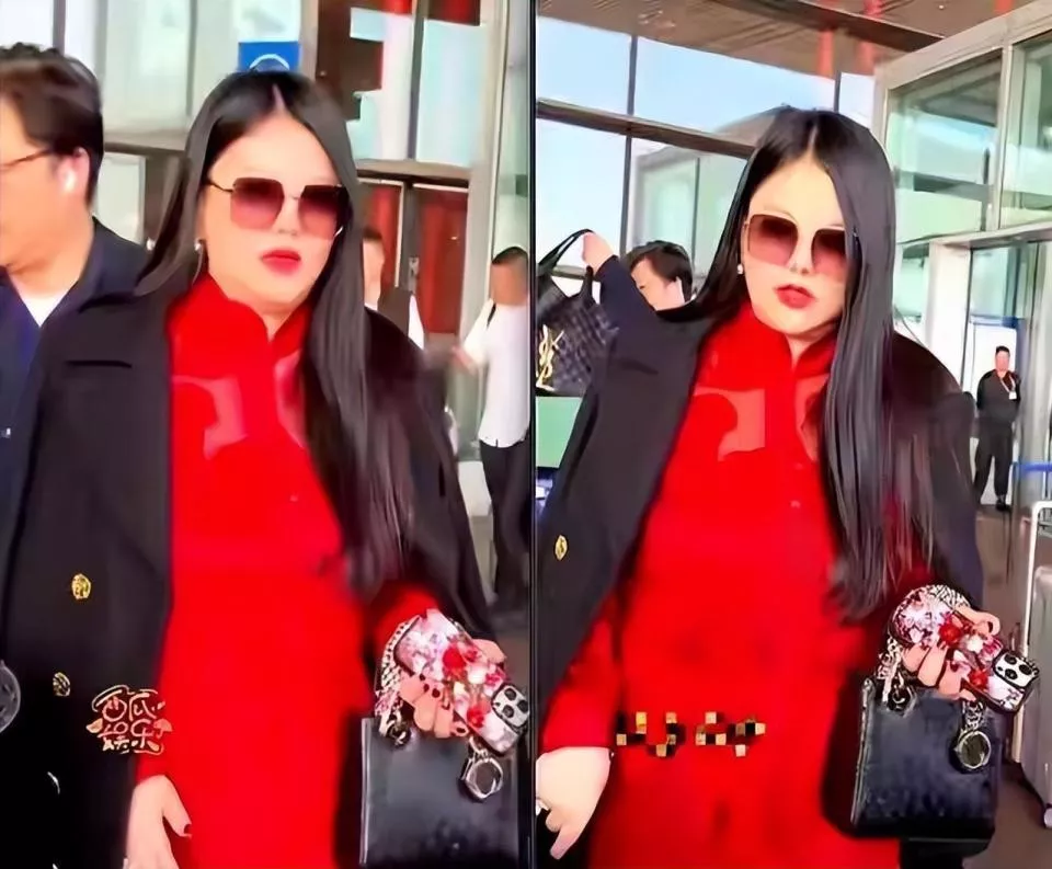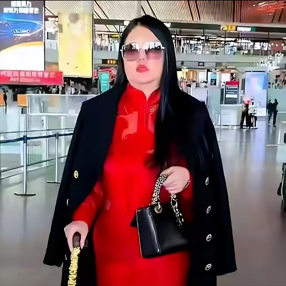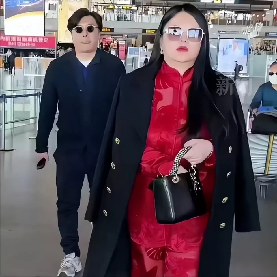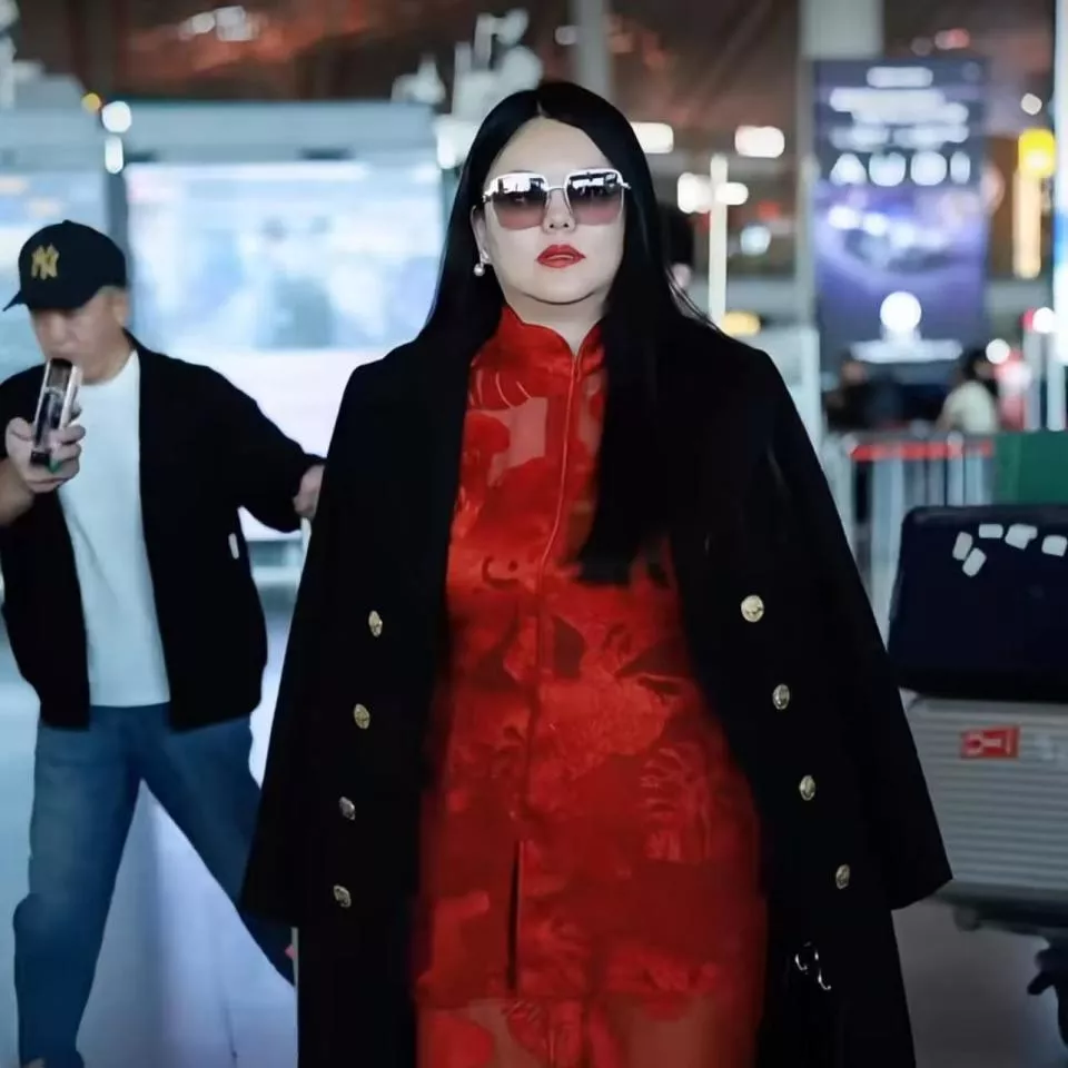 在机场的路透图中她穿着一个大红色的打底,披着黑色的大衣,