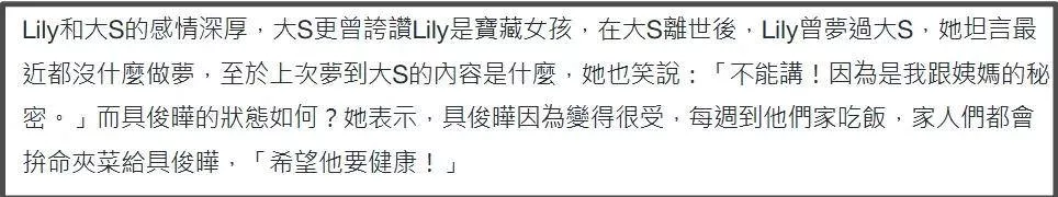 活动现场小S二女儿心情相当不错,台媒都用“甜笑”来形容她的状态,被问到姨妈大S,小S二女儿直言都没有“梦”到姨妈了,被问到姨父具俊晔,小S二女儿瞬间话多了起来。