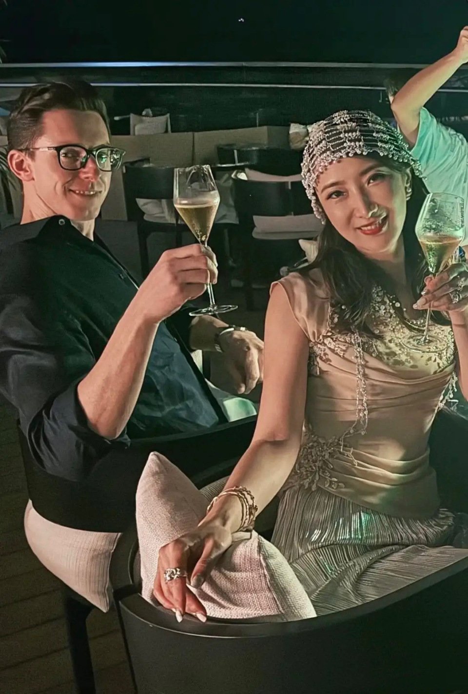 晚宴的时候,他们举杯庆祝。几个朋友也都换了礼服,大家都很有仪式感。许婧的第二套衣服,是很有异域风格的连衣裙。