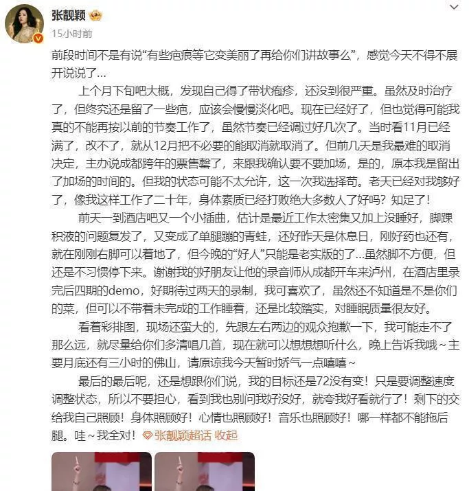 张靓颖的发病时间线与密集行程高度重合。 她提及治疗后的皮肤损伤直接影响舞台形象设计。