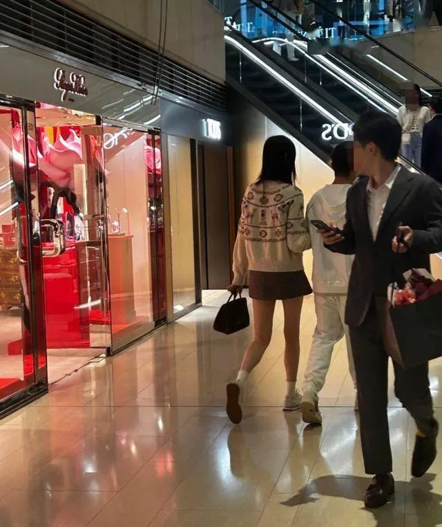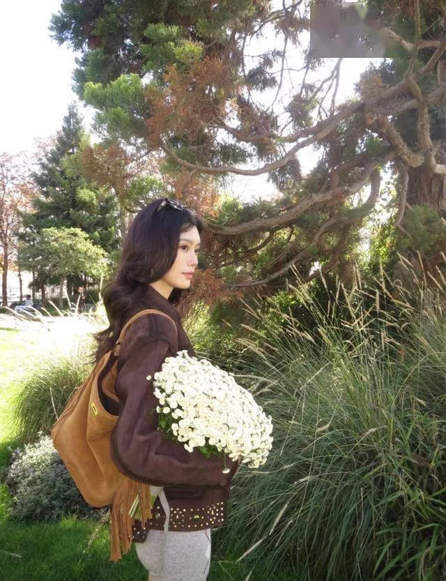 俩人边看边往前走。就算是背影,看起来也是贵气十足。她背了一个棕色有白色毛茸茸边的小包包。