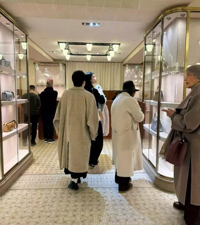 、黑色鞋子。她手里拿着一件白色毛茸茸外套,眼睛看着专柜里的爱马仕包。仔细看发现,她的气质很好。