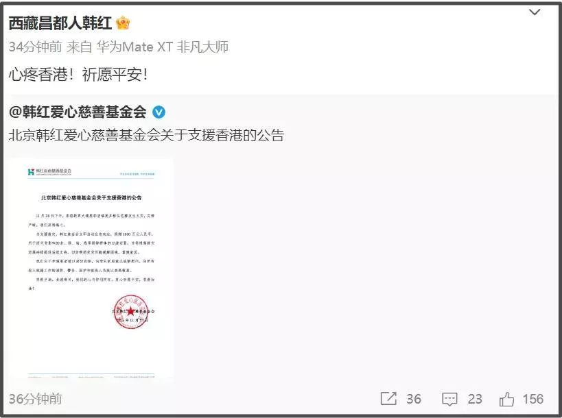 韩红本人也是第一时间转发基金会捐款公告,留下一句:“心疼香港!祈愿平安”————韩红基金捐出的一千万汇集多方力量,希望能帮助到更多人吧。