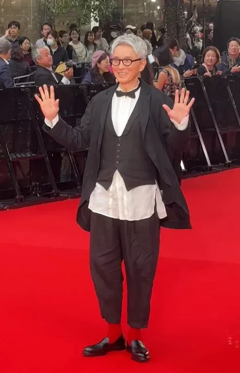 日本明星更是来了不少的大腕,《孤独的美食家》里的松重丰一亮相就想吃饭了,他这造型也是有点别致啊,皱皱的萝卜裤配了双红袜子,上半身又是大码白衬衣配黑马甲,好凌乱的穿搭啊。