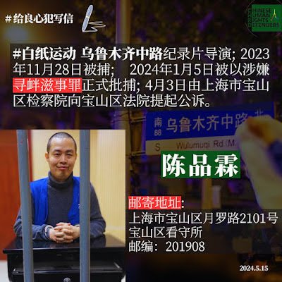 陈品霖简介:网名Plato,白纸运动《乌鲁木齐中路》记录片制作人。生于1991年8月8日,福建省霞浦县人。