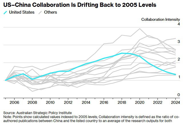 该追踪器分析了74个关键领域、700多万篇论文。报告称,合作强度——即共同署名论文在总体科研产出中的占比——已回落到2005年的水平。该报告于周三(26日)发布。