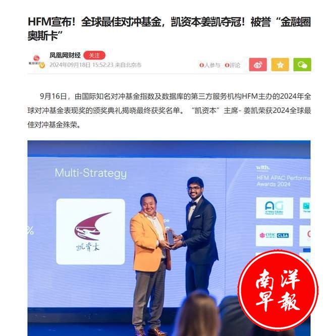 近日,小编被一则经济类新闻吸引。姜凯主理的凯资本Kai Capital荣获“2024年度全球最佳多策略对冲基金”。