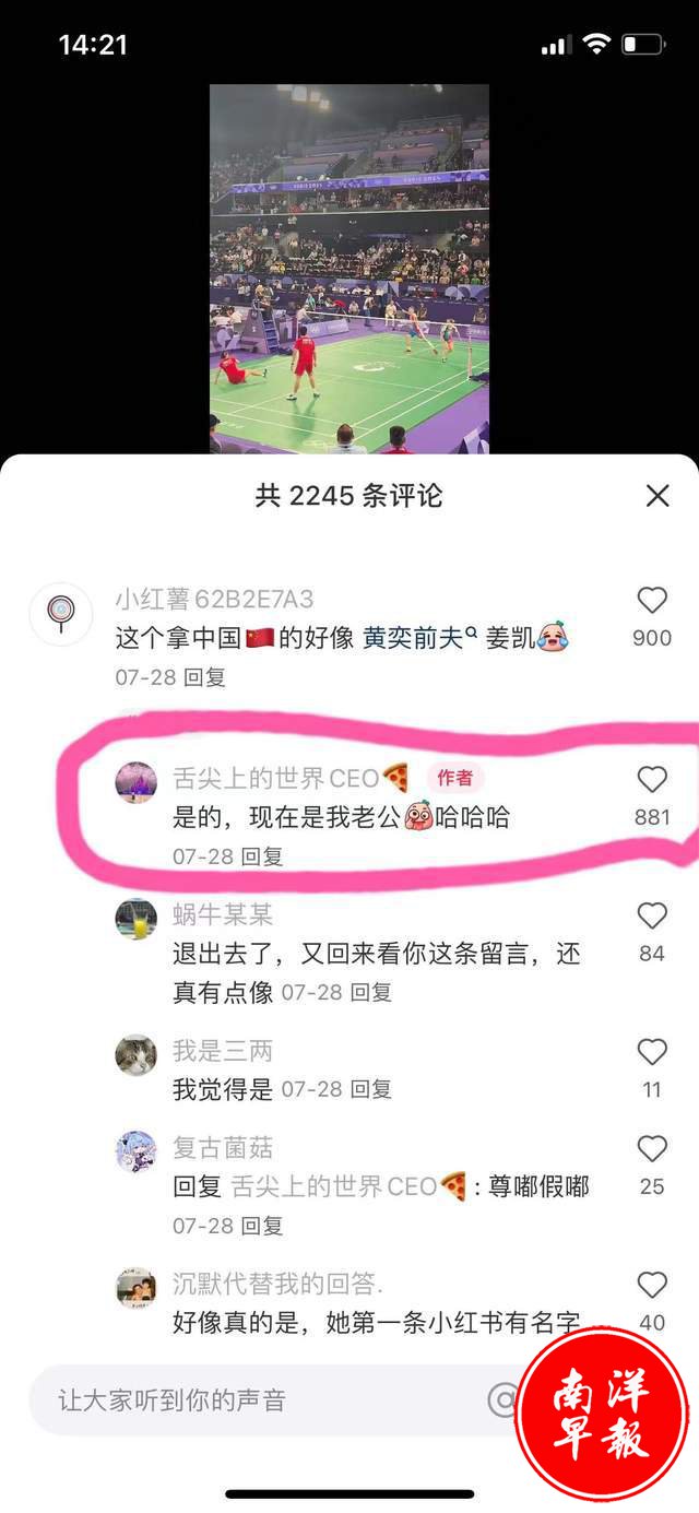 眼尖网友立刻在社交平台发现了他的身份,立刻留言问 是不是黄奕前夫。姜凯的现任妻子倒也大方,礼貌回复网友说:“是的,现在是我老公。”